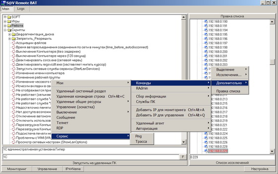 ![]() BatWithParameters - бесплатное приложение для управления сетью. Программа позволяет выполнять на удаленном компьютере под управлением Windows XP любые действия, ограничиваясь только Вашей фантазией, устанавливать удаленно программы, выполнять мониторинг важных системных параметров и уведомлять администратора при их изменении... Основные возможности программы: База скриптов Очень быстрое сканирование диапазона IP адресов + Возможность указать к каждому адресу свои данные авторизации Программа позволяет запускать удаленно и локально *.bat - файлы они же батники В наличии имеется база скриптов Базу скриптов можно расширять и редактировать Каждый скрипт является автономной единицей (сделано специально для удобства и гибкости) Скрипт можно запускать как из интерфейса программы так и вручную Поддержка программы RAdmin Viewer 3 (управление, просмотр, телнет, передача файлов, сообчения, чат...) Создание отчетов (различная информация) по компьютерам сети (присутствует возможность экспорта в *.csv - файл) Можно "прикрутить" WPI Базы скриптов можно хранить на FTP Мониторинг компьютеров сети Опрос компьютеров сети по различным параметрам Поддержка программы Aida64 (показания датчиков, информация о железе) Гибкая настройка уведомлений Цветов элементов мониторинга Логирование Отправка уведомлений на e-mail (следовательно можно сделать и отправку смс на телефон) Звуковые оповещения Всплывающие сообщения Среди возможностей мониторинга Сбор скриншотов по сети и их просмотр Состояние файлов, драйверов, служб, реестра, процессов Получения различных сведений о системе ![]() Скачать программу BatWithParameters (9,65 МБ): | |